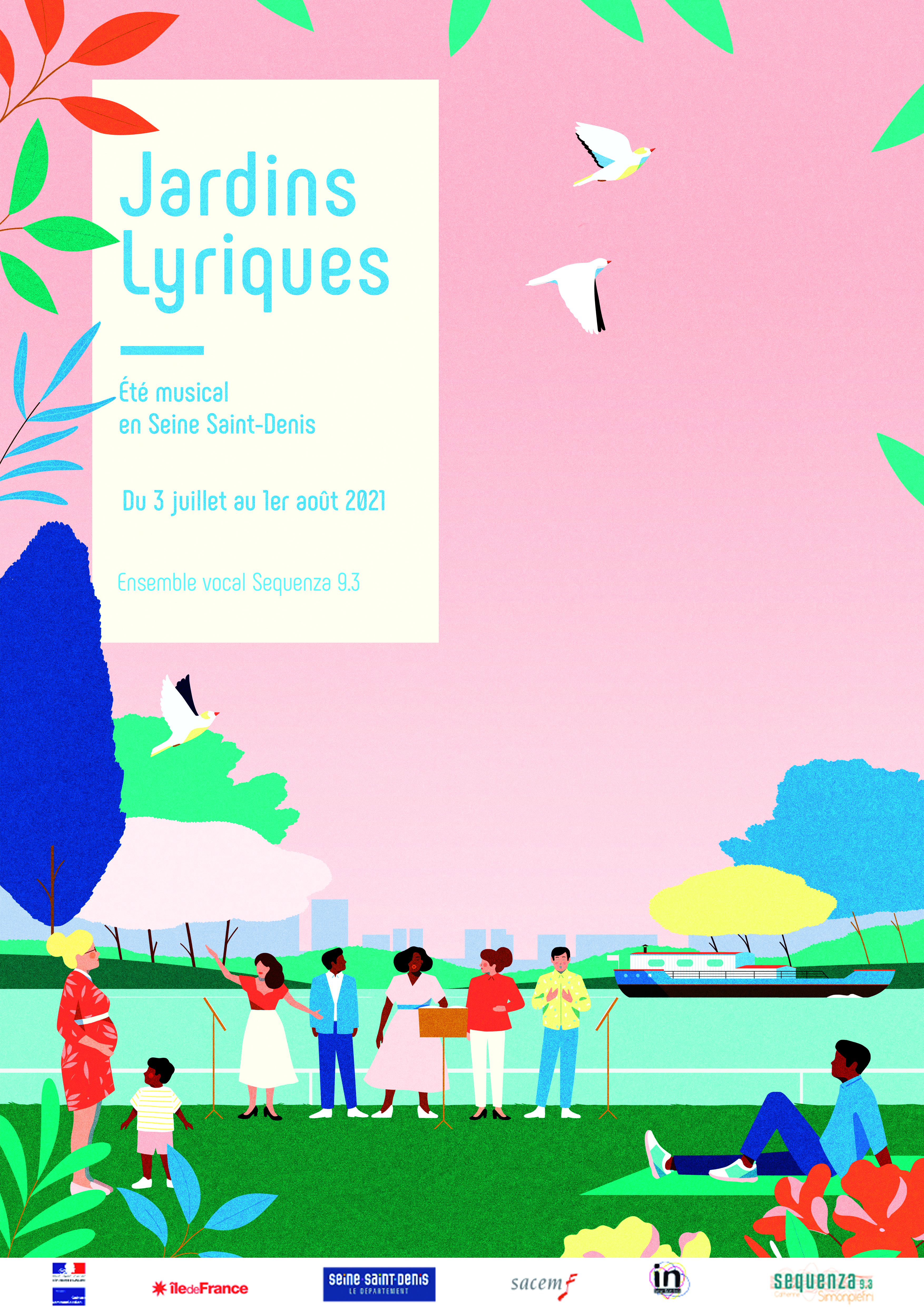 Depuis 2018, l’Ensemble vocal Sequenza 9.3 propose durant tout l’été un voyage bucolique, artistique et à portée de tous les publics, intitulé Jardins Lyriques. Une forme innovante et gratuite pour « décloisonner » la pratique vocale lyrique et aller à la rencontre des publics en proposant des moments musicaux de qualité et des formes ludiques et accessibles au plus grand nombre : concert en plein air, atelier de pratique et d’écoute, jeu de piste musical...